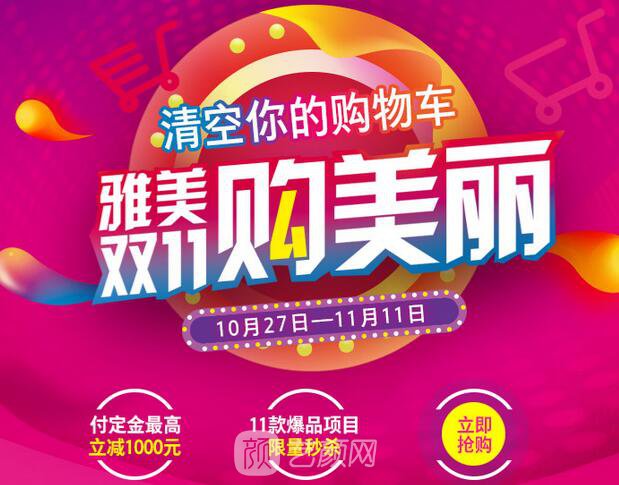 长沙雅美医疗美容医院——雅美·双11购美丽,隆重推出“清空你的购物车”活动~一年仅一次 宠你没商量,付定金立减1000元,11款爆品项目限量优惠力度大,人气变美项目来就送,你购物我买单,充值双倍 美丽翻倍,上门礼、消费礼、大咖礼专属于你。