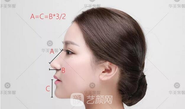 理想的鼻长度应该与嘴唇缝到下巴底端的长度相等,鼻长和鼻尖突出的高度比应该是3:2。
