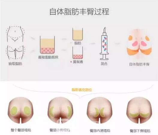自体脂肪丰臀:采用腰腹或大腿等脂肪较丰厚的部位,将这些部位的脂肪颗粒移植到臀部中上缘和外侧,同时臀部下缘采取吸脂,使臀型清晰、圆润。